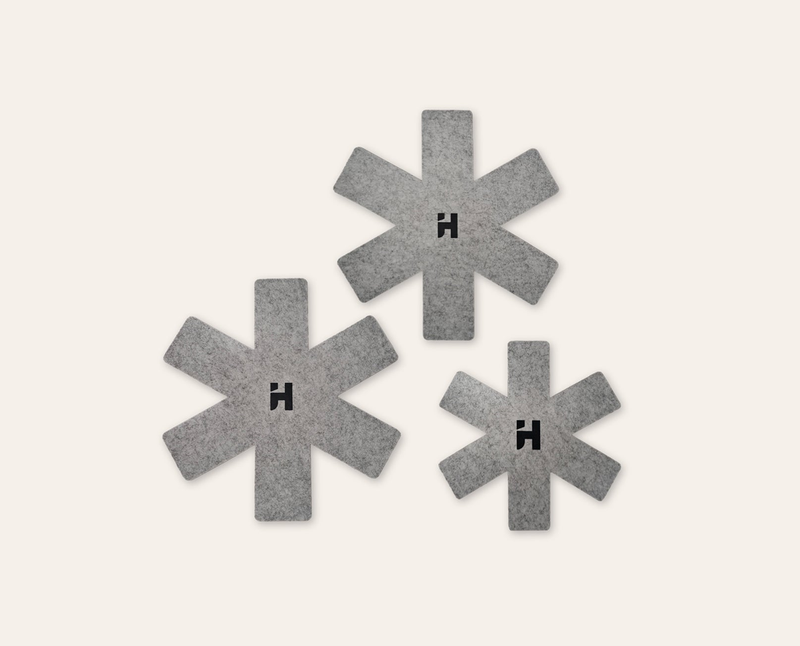 Apsaugokite ir keptuves, ir paviršius! Šios minkštos, neslystančios veltinio apsaugos patikimai saugo keptuves bei puodus nuo įbrėžimų, kai jie sudedami vienas ant kito. Taip pat galima naudoti kaip karštų indų padėkliukus – apsaugosite stalviršius ar stalą nuo karščio dėmių.