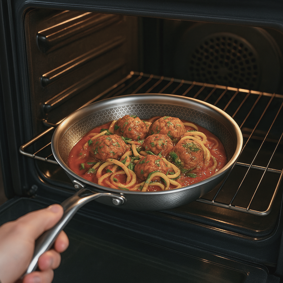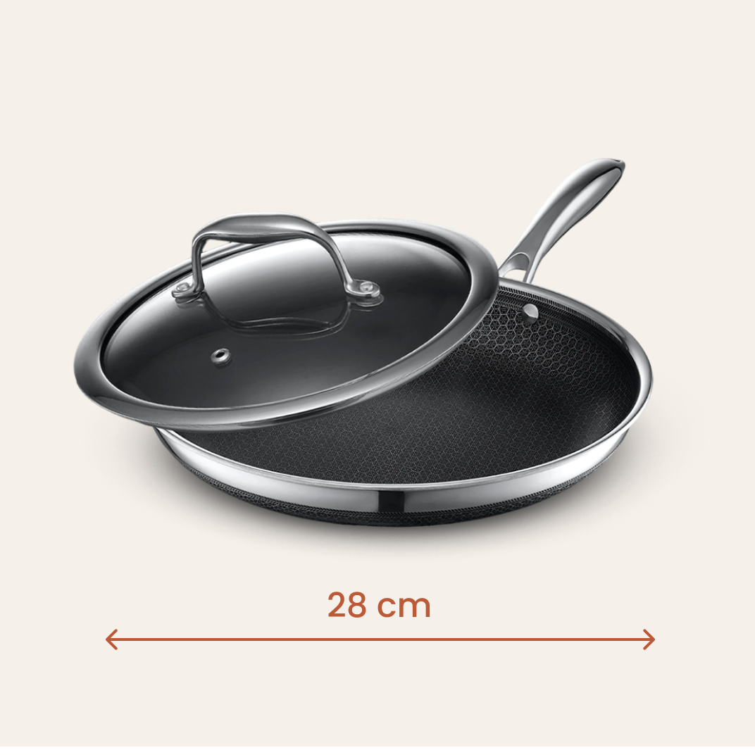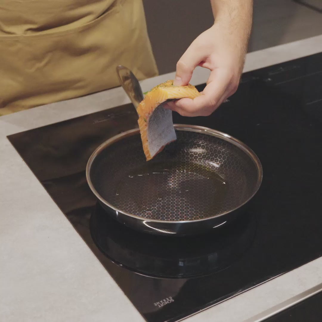 Magnetinio plieno dugnas užtikrina, kad ši keptuvė puikiai veikia su indukcinėmis, dujinėmis, elektrinėmis ir kitomis kaitlentėmis.