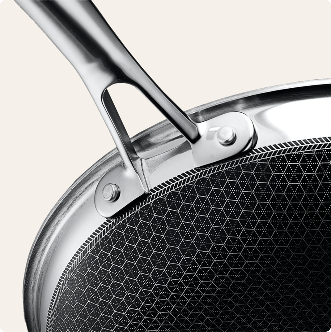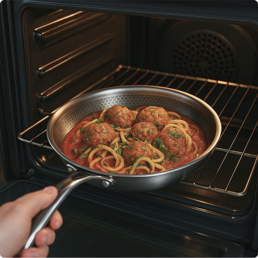 Lyginant su tefloninėmis keptuvėmis, galima naudoti metalinius įrankius
